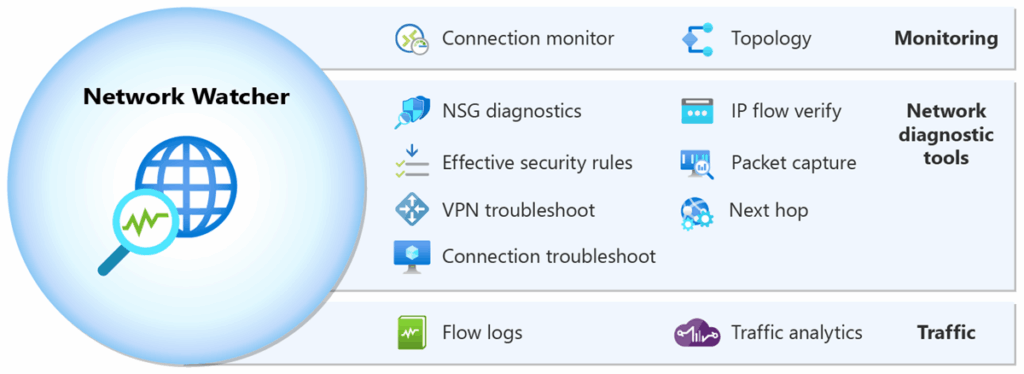The network watcher encompasses three primary sets of tools and capabilities that enhance the management and monitoring of network infrastructure: