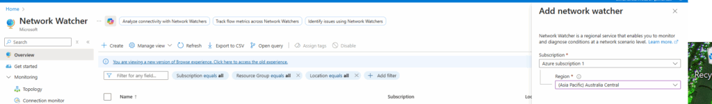 Note: When you create a Network Watcher instance using the Azure portal, it is automatically named NetworkWatcher_{region}, matching the region (e.g., NetworkWatcher_australiaeast for Australia East). The instance is placed in a resource group called NetworkWatcherRG, which is created if it doesn’t exist. You can customise the names using PowerShell or REST API methods while creating Network Watcher.