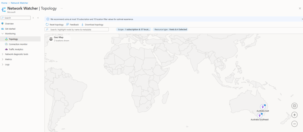- Select Network Watcher and click on Topology under the monitoring section. You will see the Azure regions where you have created virtual networks. In my subscription, I have resources created in the Azure Australia East and Australia Southeast regions.
