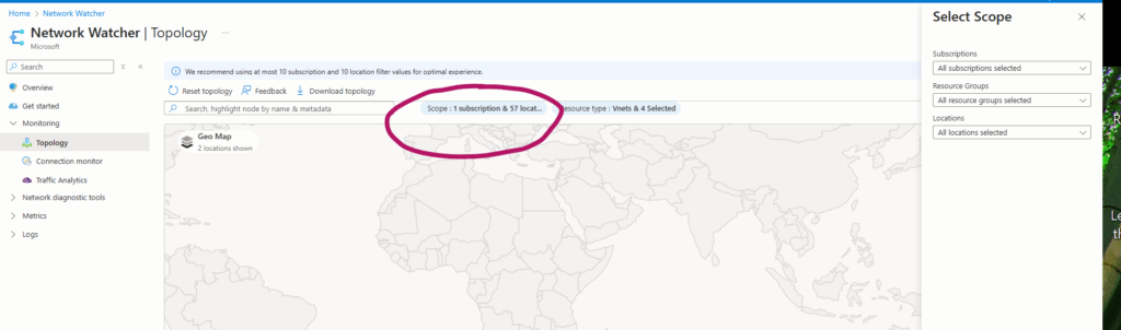 - We can choose to select the scope for your network watcher topology, including subscriptions, regions, and resource groups. To change the scope, click the scope and choose your desired scope.