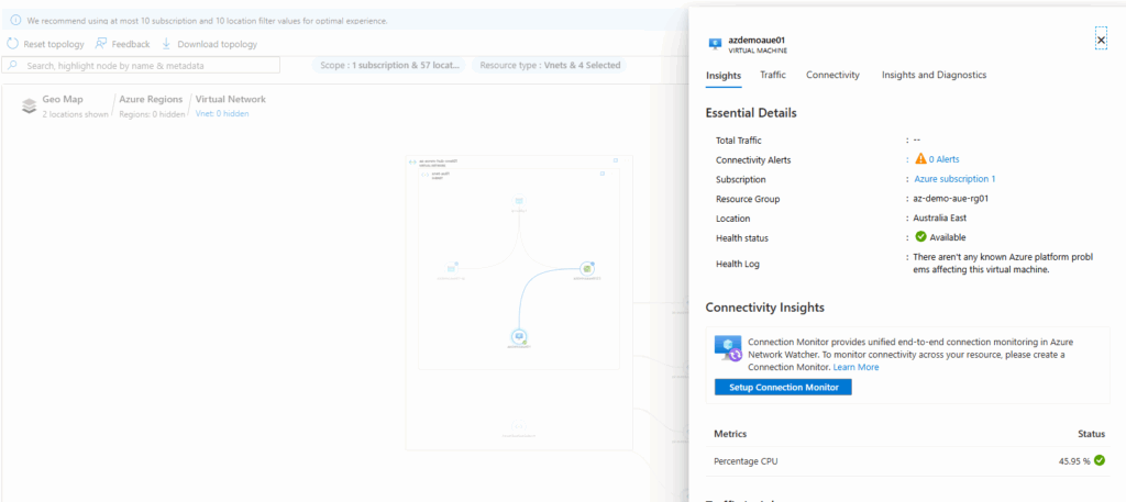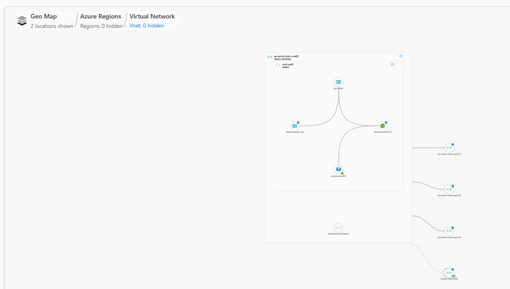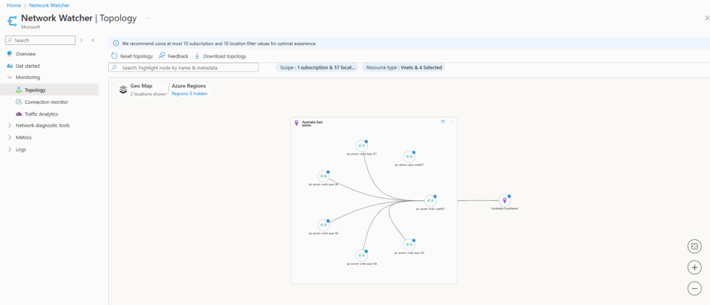 The Topology tool provides a comprehensive visualisation of your entire network, enabling a clear understanding of your network configuration. It features an interactive interface that enables you to view resources and their interrelationships across multiple subscriptions, resource groups, and geographic locations within Azure.