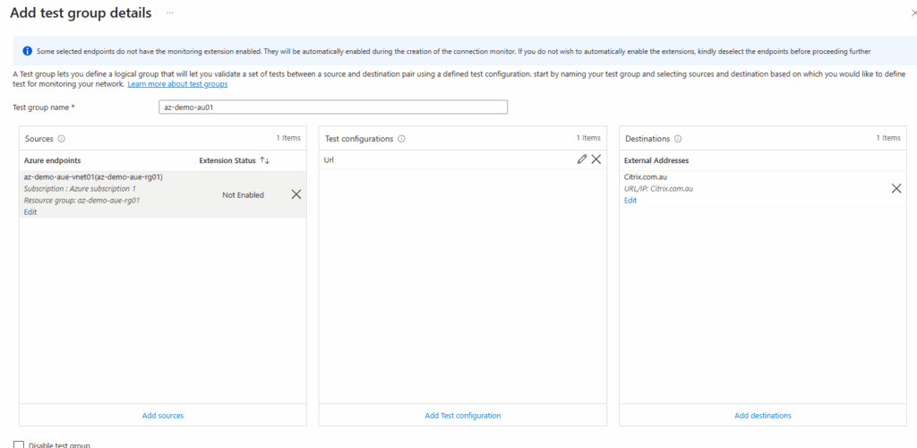 - Under the test group tab, choose your source VM or endpoint and choose the destination endpoints. for my testing, let me choose VM as the source and external endpoint (website) as the destination.
