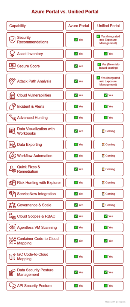 This section offers an in-depth comparison of Microsoft Defender for Cloud’s features and capabilities, highlighting the differences between the Azure and Defender portals. By understanding these differences, you can make informed decisions about which platform best suits your security operations and fully leverage the enhanced functionalities until the full scope is available in the Defender portal.