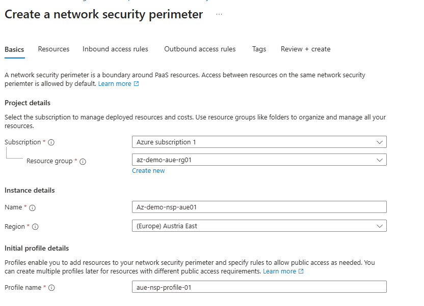 • Provide the required information for creating NSP services, such as Name, Resource group, location and Profile name.