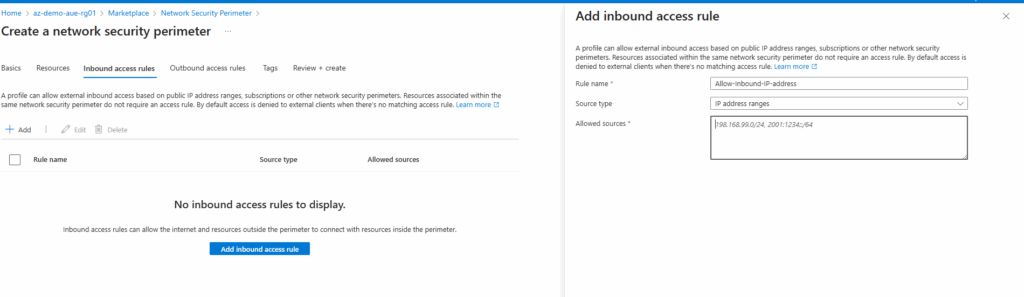 • In the next section, ‘Inbound Access Rules,’ select ‘+’ Add. In the Add inbound access rule window, enter the rule name, source type and source information and select Add: